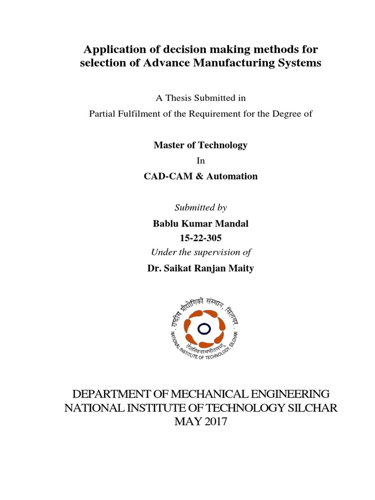 Multi-criteria decision making (MCDM) tools are used as a natural approach for evaluating alternatives with respect to conflict criterion, and target market selection can be considered as an MCDM The consumer decision making is a complex process with involves all the stages from problem recognition to post purchase activities. All the consumers have their own needs in their daily lives and these needs make them make different decisions A thesis, or dissertation (abbreviated diss.), is a document submitted in support of candidature for an academic degree or professional qualification presenting the author's research and findings. In some contexts, the word "thesis" or a cognate is used for part of a bachelor's or master's course, while "dissertation" is normally applied to a doctorate.. This is the typical arrangement in